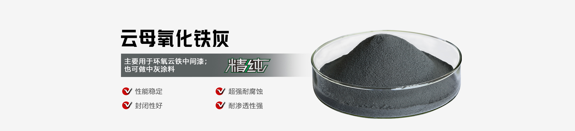 云母氧化鐵(灰)是一種化學性能穩定的片狀顏料,不易與酸、堿、鹽等起反應,耐高溫,無毒;其閃亮度高,徑厚比大,質地細膩,色澤純正,粒度分布科學。在漆膜中具有特別好的封閉性和耐候性,光敏性弱,對腐蝕介質及水汽等均有很強的耐滲透和隔絕能力,并能大量吸收和反射紫外線。通過改性處理,在水性體系里防腐性能優異。