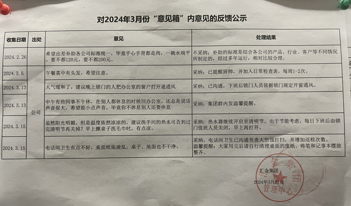 作為焦作市人大代表的郭榮勛,在功成名就后,他樹立“承擔+胸懷+溝通+平等”的核心理念,不斷創新民主管理實現形式,并在詹店工廠和鄭州總部員工必經處(如廁所、廠區二道門等)設立多個意見箱,同時附上意見反饋二維碼,以便廣泛收集員工訴求。員工可寫意見信或手機掃碼匿名提意見,意見直通公司高層決策群,他協調管理中心第一時間處理,并定期將處理結果通過集團微信群告知各位員工。對于員工提出的改善伙食問題,他予以高度重視并召開會議快速討論,一方面提高伙食費標準,另一方面加強對食堂及廚師的日常監督,每月月末對廚師進行考評,征求全體員工的意見,并對不滿意的菜品進行改善, 確保員工能夠吃飽、吃好。有員工提出“由于冬天天黑的早,下午5:30下班到家,天已經黑了”,為了員工安全考慮,他安排公司提前半小時下班,將原本8小時工作制改為7.5小時。通過系列措施,積極建設“幸福之匯金”,讓全體員工共享企業發展成果。